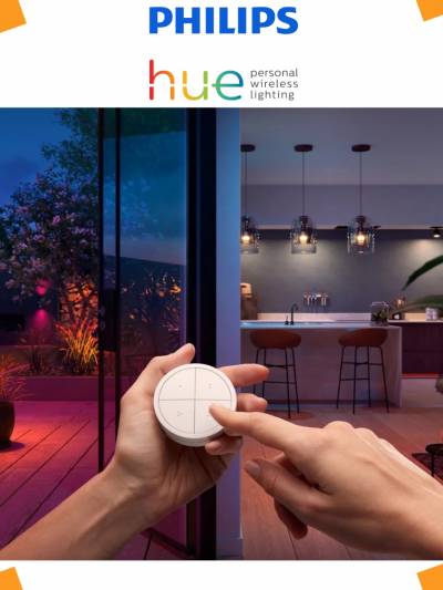 С помощью беспроводной переключателя Philips Hue Tap, регулирует яркость поворотом диска. Чем быстрее вы поворачиваете его, тем быстрее ваши огни становятся ярче или тусклее.