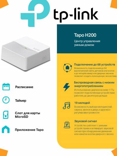 Центральный блок имеет встроенный дверной звонок с 19 мелодиями звонка и сиреной, поэтому вы можете использовать его как в качестве дверного звонка, так и в качестве будильника. Вы можете использовать смарт-кнопку в качестве кнопки вызова дверного звонка. Вы можете отключить звук дверного звонка с помощью кнопки отключения звука на центральном блоке. С помощью датчика движения и/или датчика двери/окна из него можно построить охранную сигнализацию, чтобы при обнаружении датчиками движения или открытии датчика двери/окна центральный блок оповещал громким сигналом. Звук 90 дБ о возможном взломе. H200 также может использовать другие устройства, подключенные к приложению Tapo, например интеллектуальные розетки и лампы. С помощью хаба можно создавать умные функции или тайминги, на основе которых работают розетки и подают питание на подключенные к ним устройства.