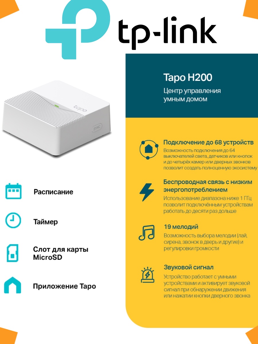 С помощью контроллера домашней автоматизации TP-LINK Tapo H200 вы можете легко построить себе управляемый и автоматизированный умный дом с дистанционным управлением. К нему можно подключить до 64 + 4* устройств Tapo**, таких как термометры, датчики дверей/окен, датчики движения или кнопки. К концентратору H200 также можно подключить в общей сложности четыре совместимые камеры наблюдения Tapo или видеодомофоны.