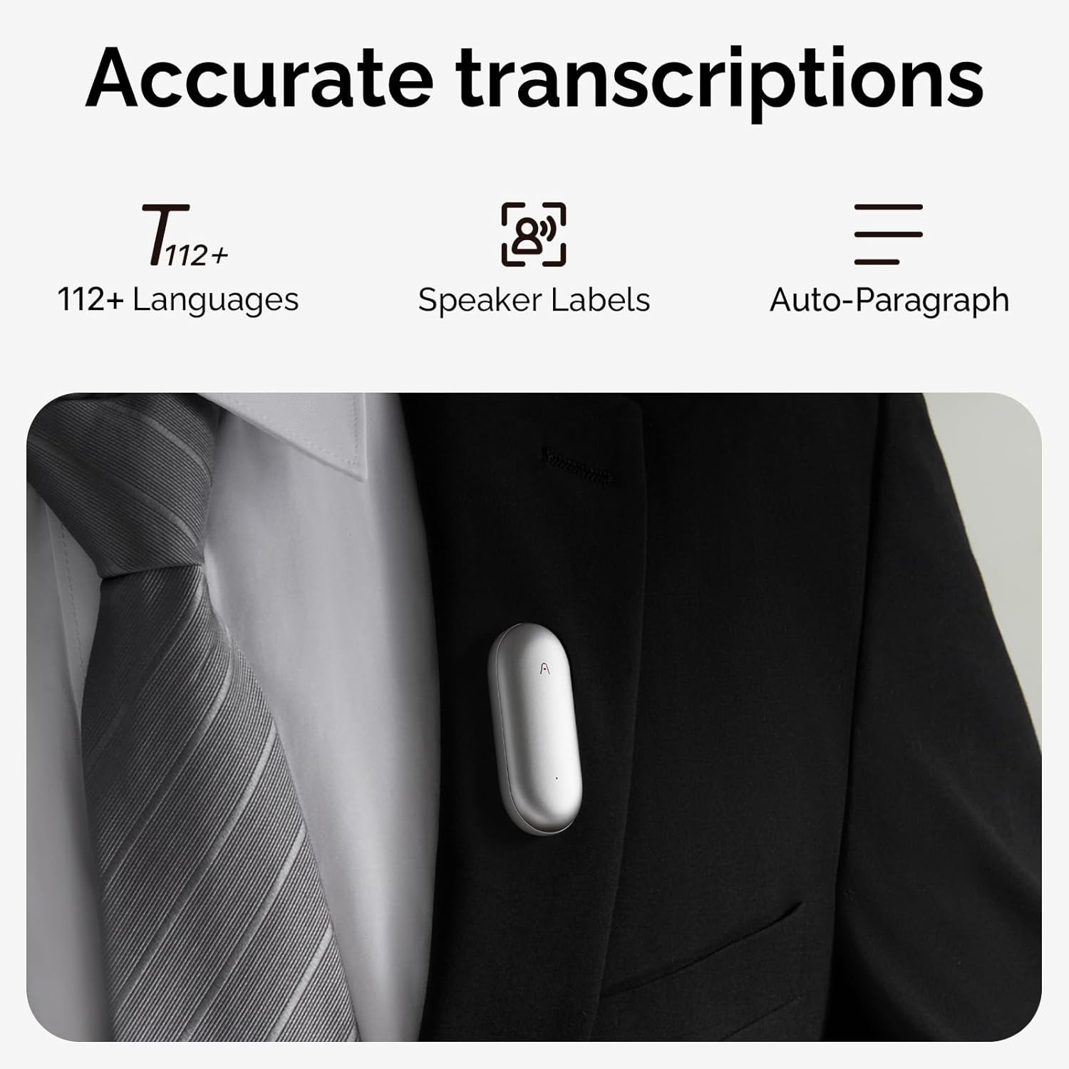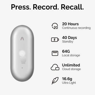 БЕЗ ЗАТРУДНЕНИЙ И ПРОБЛЕМ: PLAUD NotePin сверхкомпактен, весит всего 0,59 унции. Аккумулятор емкостью 270 мАч обеспечивает 20 часов непрерывной записи. Простая операция одним нажатием для начала или остановки записи с улучшением на основе ИИ и шумоподавлением.
