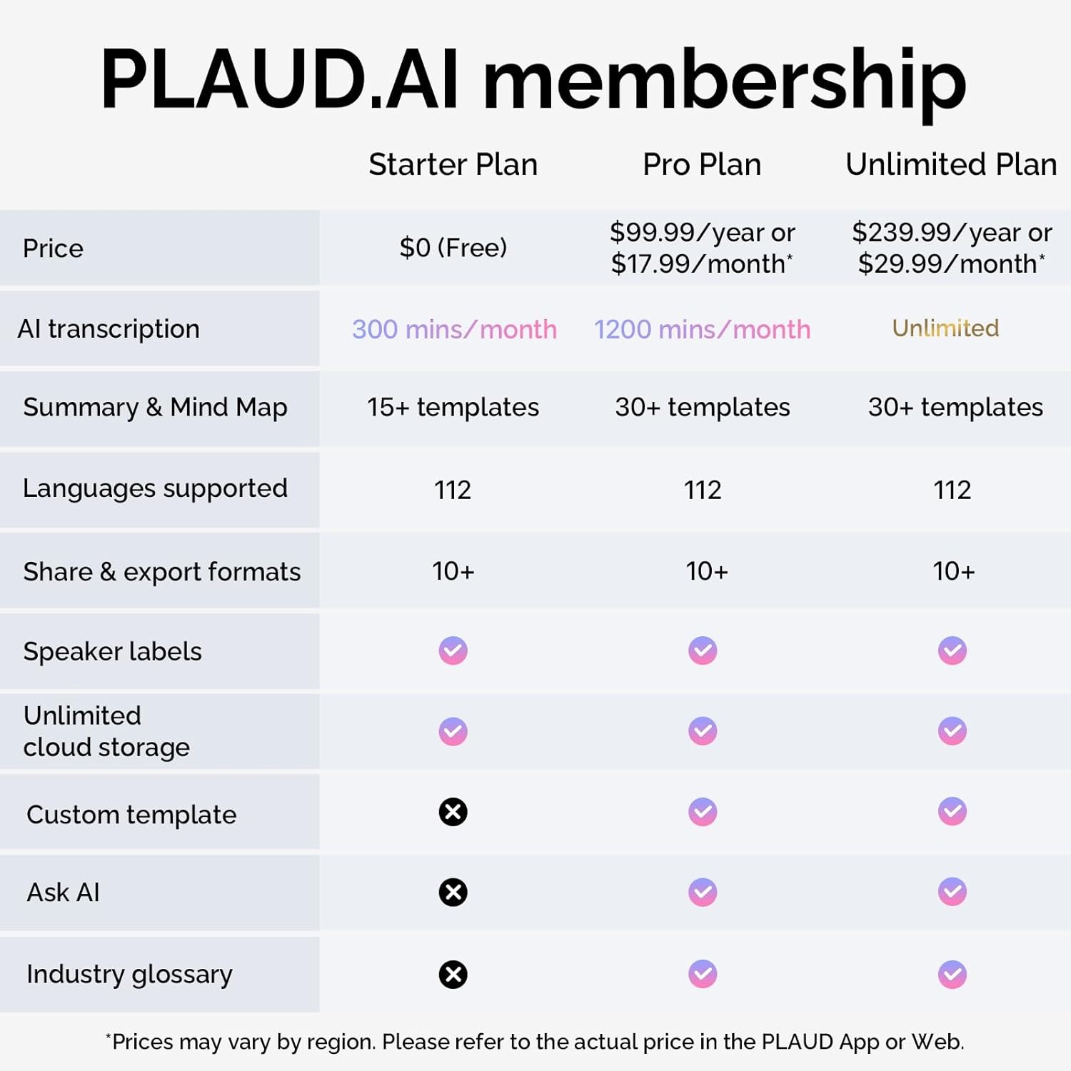 Примечание: Активируйте PLAUD NotePin, чтобы получить бесплатный Starter Plan с 300 минутами транскрипции AI в месяц. Обновитесь до Pro Plan за $99/год или $17,99/месяц, чтобы разблокировать 1200 минут транскрипции, пользовательские шаблоны и расширенные функции, такие как Ask AI.