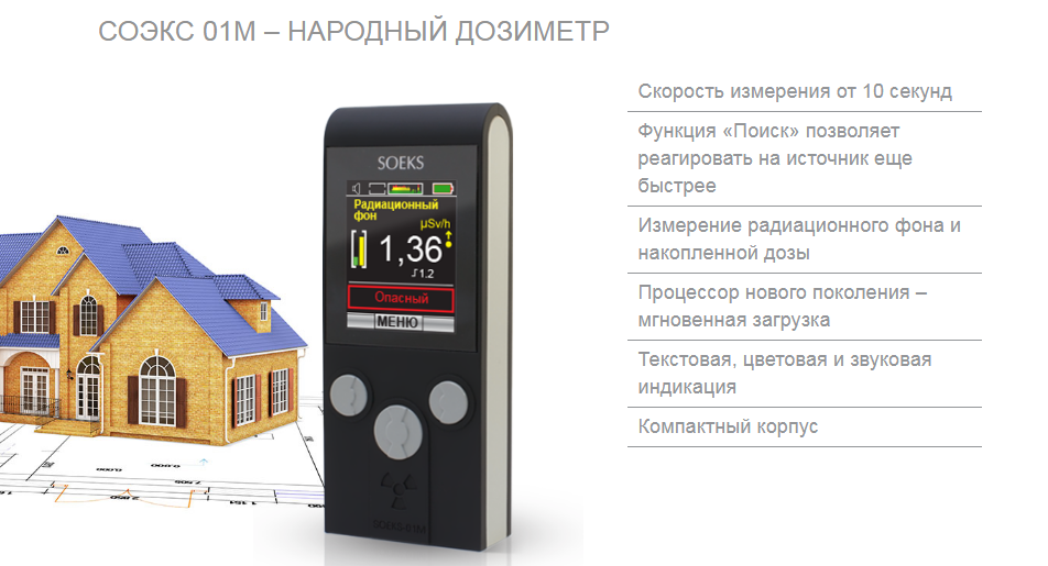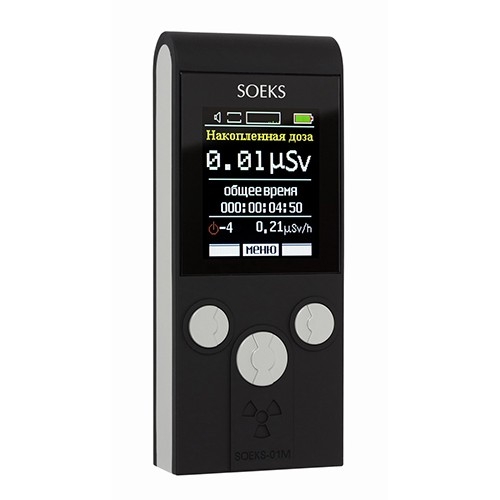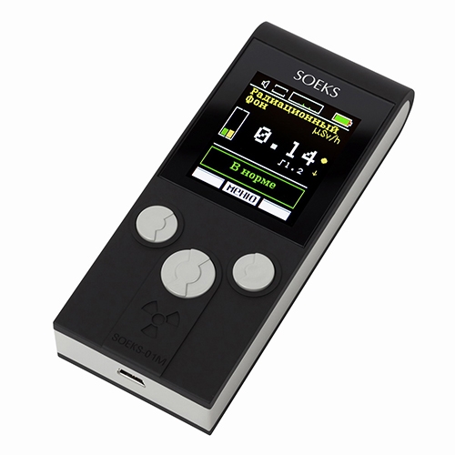 СОЭКС 01М - самый популярный бытовой дозиметр в мире. Усовершенствованная версия СОЭКС Дефендер. Унаследовал от своего предшественника яркий цветной дисплей и компактные размеры. Функциональность, простота использования и демократичная цена сделали его абсолютным лидером продаж в России, Японии, Германии и США. После аварии на Фукусиме, когда проблема личной радиационной безопасности встала как никогда остро, удобные и доступные дозиметры 01М приобрели особую популярность. 01М доступен пользователям, не обладающим специальными знаниями – интерфейс прост настолько, что измерить радиацию сможет даже ребенок. Для начала работ достаточно просто включить прибор – процесс измерения радиации запустится автоматически.