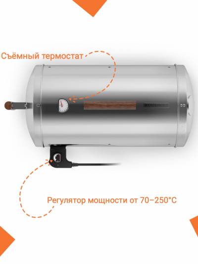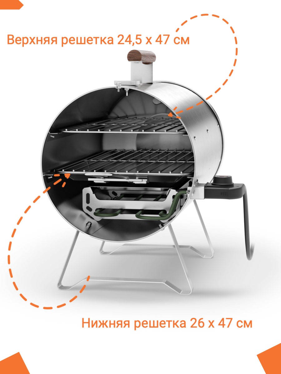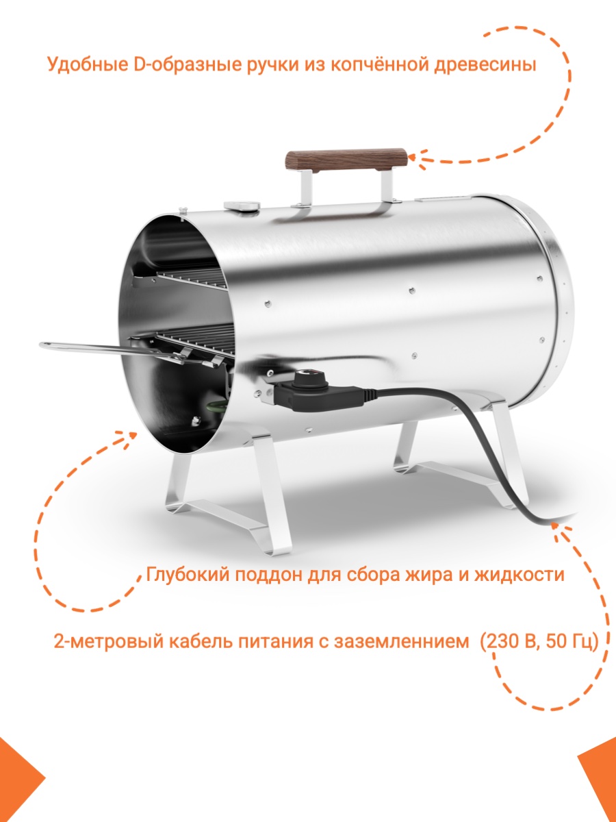 Мощная коптильня из нержавеющей стали с плавной регулировкой температуры и встроенным термометром. В комплект входят две просторные решетки, позволяющие коптить мясо, рыбу, птицу, сыр, овощи или десерты. Крышку коптильни можно удобно повесить на ручку, снимая решетки. Поставляется с 2-метровым заземленным кабелем питания (230 В, 50 Гц).