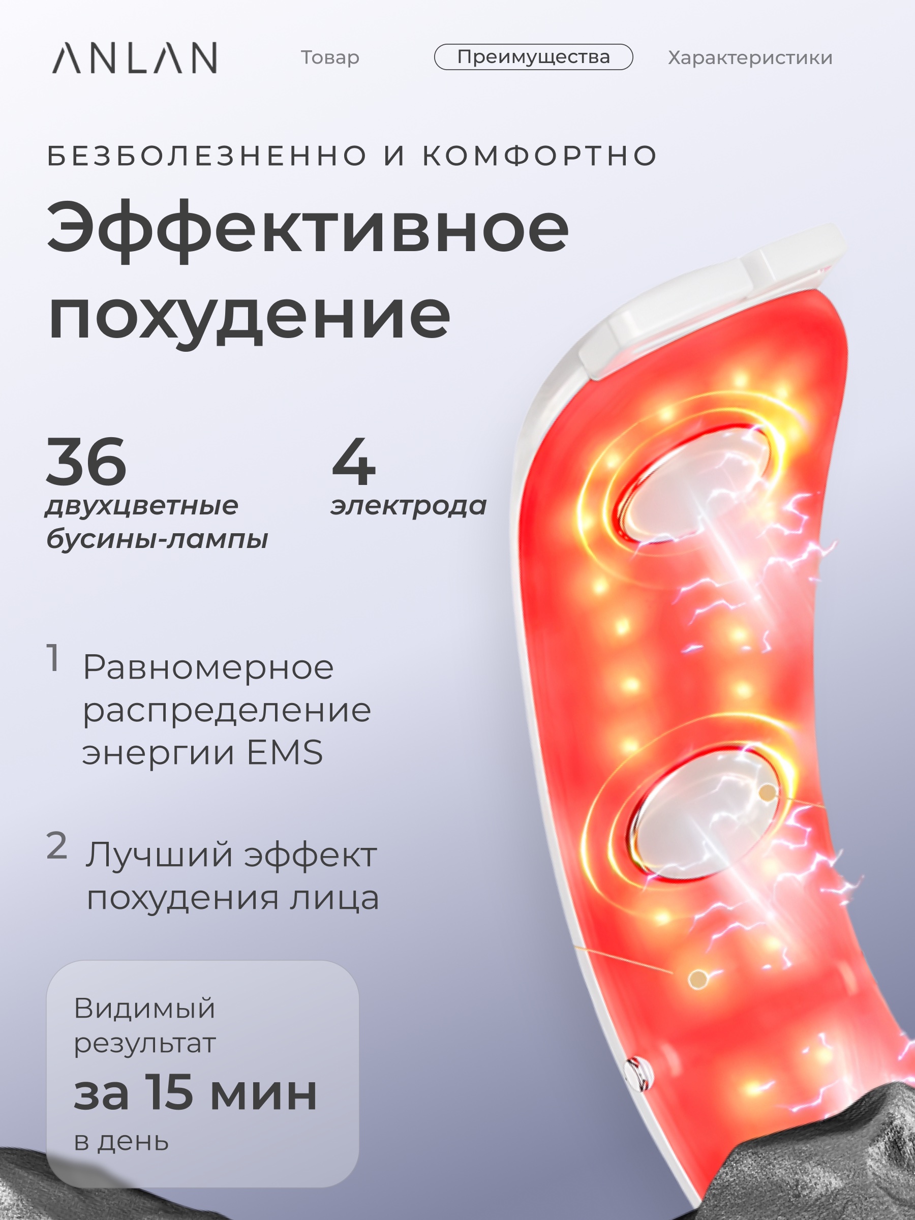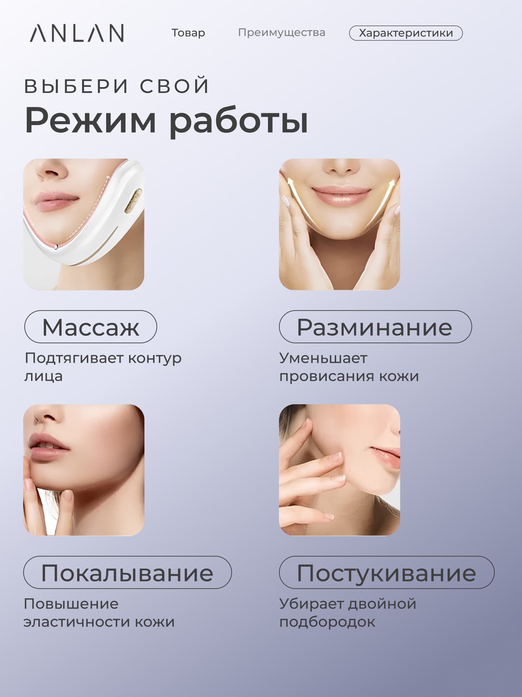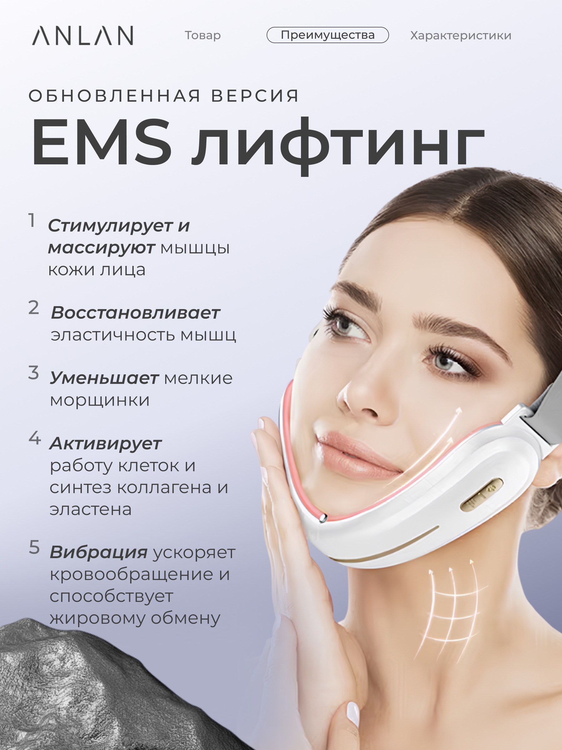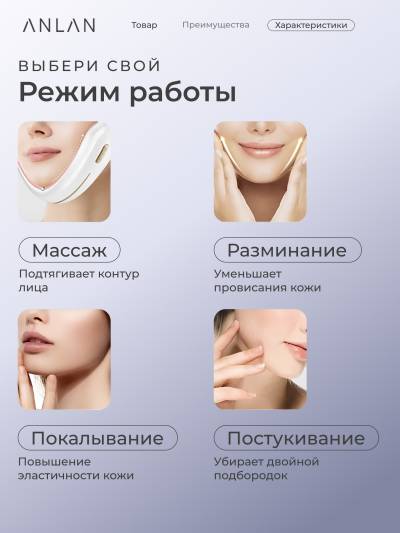 Четыре массажных электрода, использующих микротоки ЭМС, повышают эластичность и упругость кожи на разных уровнях. Благодаря девяти уровням интенсивности воздействия, пользователи могут регулировать воздействие аппарата в соответствии со своими потребностями, что делает ANLAN 01-AVLY41-02A подходящим как для бережного, так и для более интенсивного ухода.