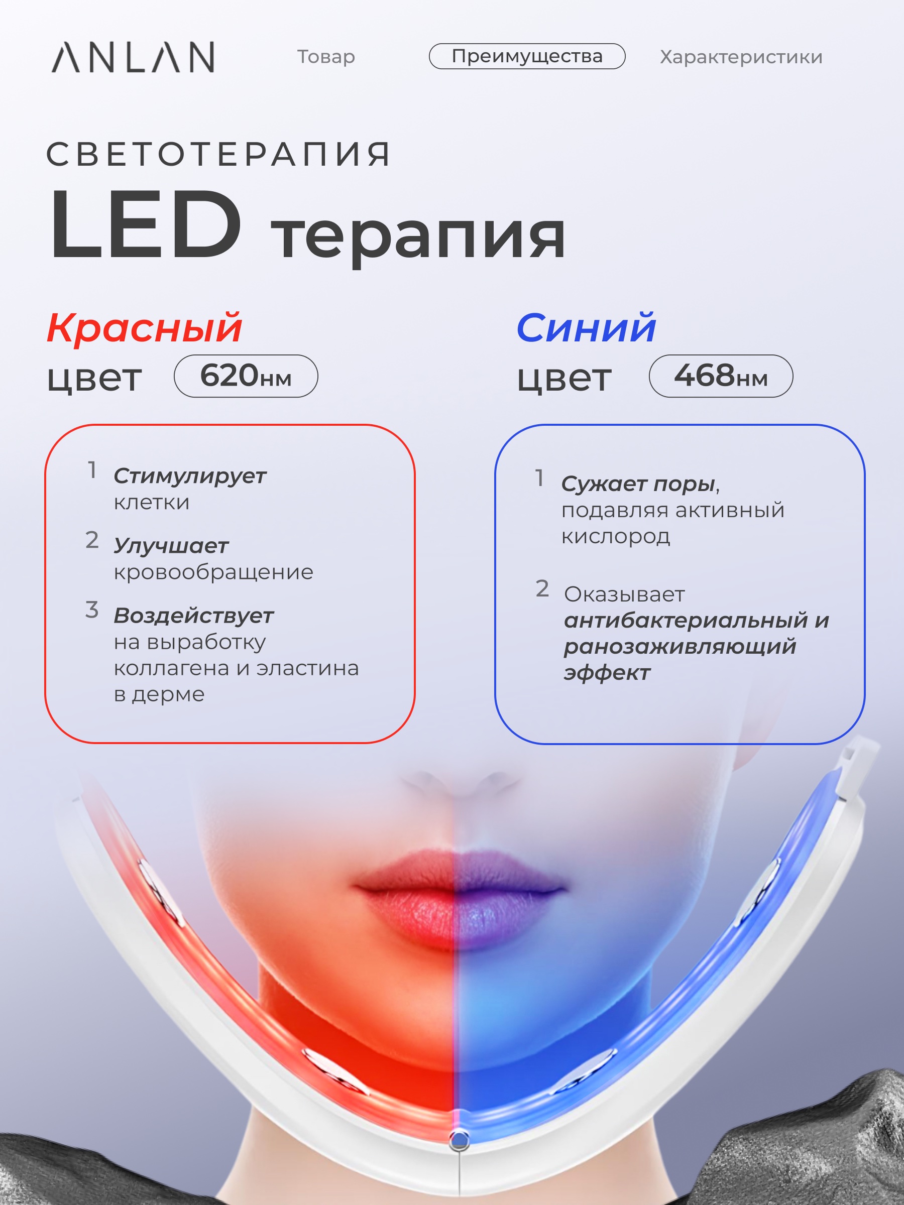 Аппарат ANLAN 01-AVLY41-02A оснащён 36 светодиодами красного и синего света, которые оказывают разнонаправленное воздействие на кожу. Красный свет стимулирует выработку коллагена и повышает эластичность кожи, делая её более молодой и сияющей. Синий свет, в свою очередь, бережно очищает кожу, снимает воспаления и успокаивает раздражения. Благодаря этому прибор способствует поддержанию здорового цвета лица независимо от типа кожи.