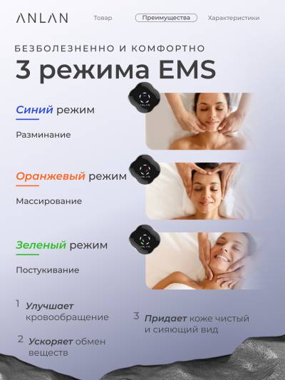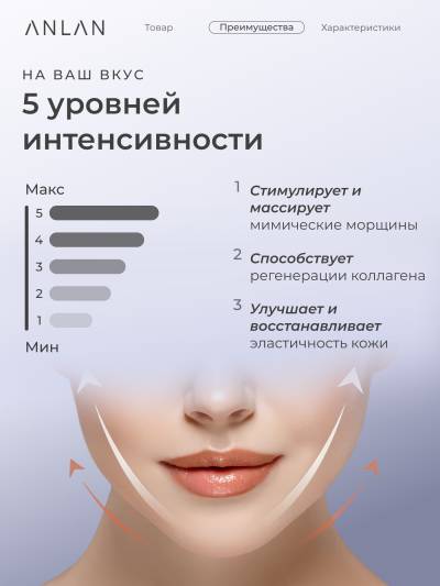 Продукция бренда Anlan позволит вам легко скорректировать контуры лица и уменьшить видимость морщин. Микротоковая терапия EMS стимулирует выработку коллагена и укрепляет кожу. Вы также можете настроить действие маски, выбрав 3 режима и 5 уровней интенсивности. Кроме того, устройство изготовлено из приятных для кожи материалов и обеспечивает комфорт при использовании.