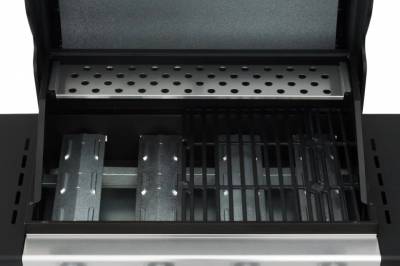 Площадка для барбекю разделена на два мангала размером 31,5 х 38 см. Каркас гриля и боковые столики изготовлены из стали с порошковым покрытием. Прочные боковые планки обеспечивают дополнительное пространство для работы. Очистка облегчается заслонкой для жира под топкой. На передней панели находится удобная корзина с принадлежностями для гриля. Решетка имеет зажигание, встроенное в ручки управления. Благодаря двум большим колесам гриль можно легко перемещать.