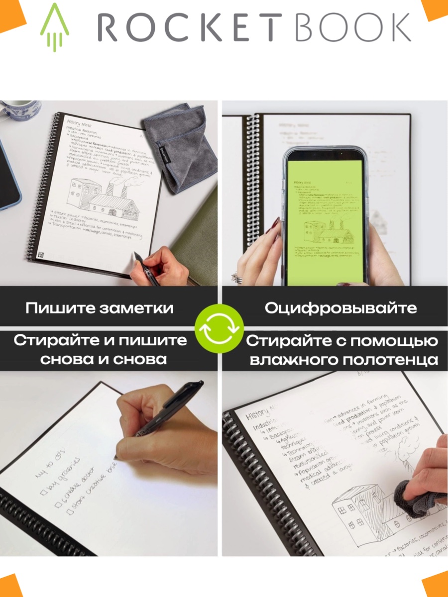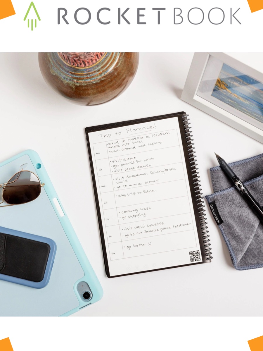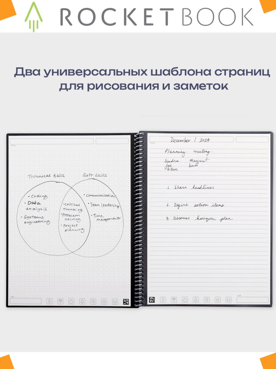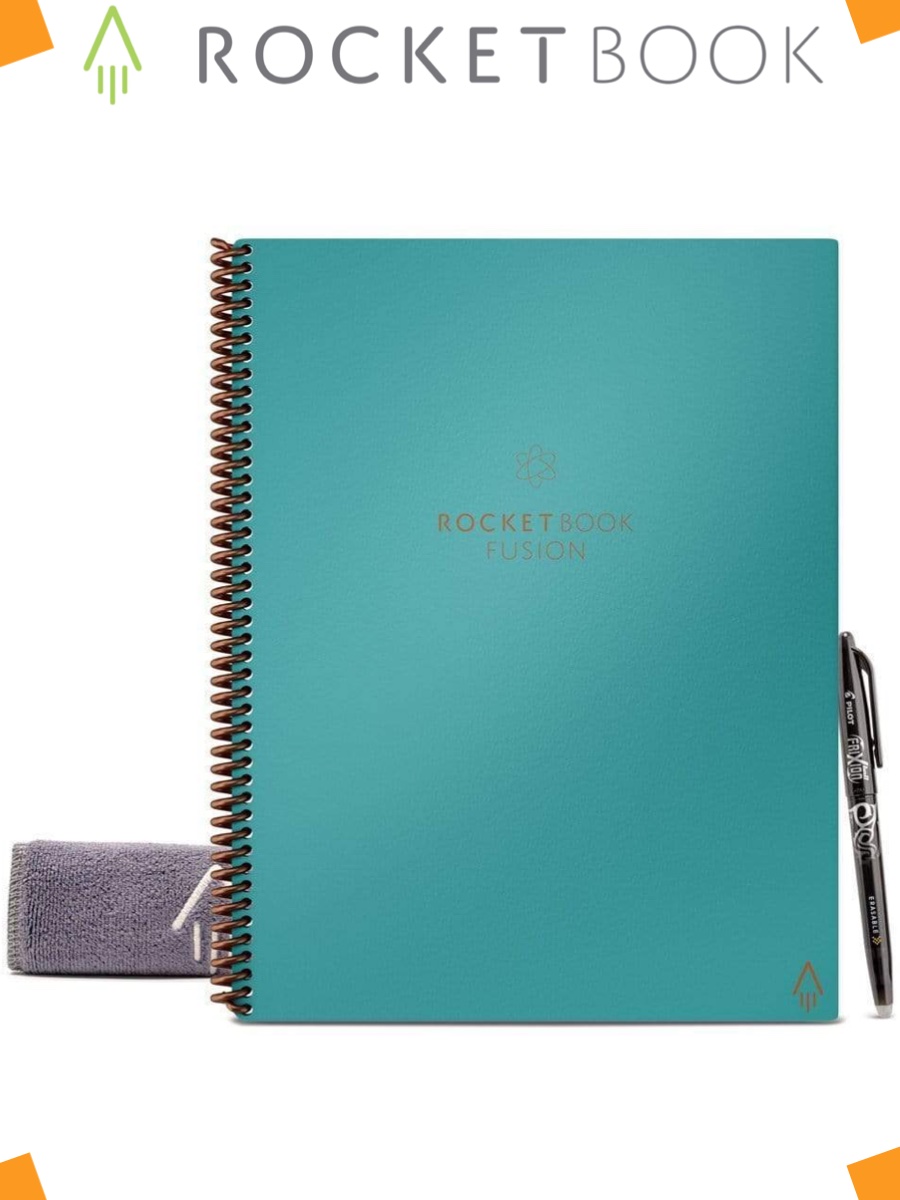 Умный блокнот Rocketbook Fusion - это многоразовая бумага, 7 шаблонов страниц и возможности переносить записи в цифровой вид.