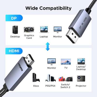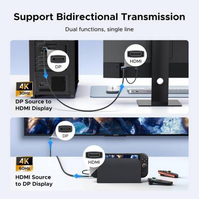 Двунаправленный 4K HDMI-DP: двунаправленный кабель, двойной опыт! Поддерживает преобразование HDMI в DP (до 4K при 60 Гц) и DP в HDMI (до 4K при 30 Гц). Например, PS5/Switch к дисплею с поддержкой DP или видеокарты к телевизору с поддержкой HDMI для подключения HD без задержек. Совместим с DisplayPort 1.2, HDCP 1.4/2.2 и HDMI 1.4.