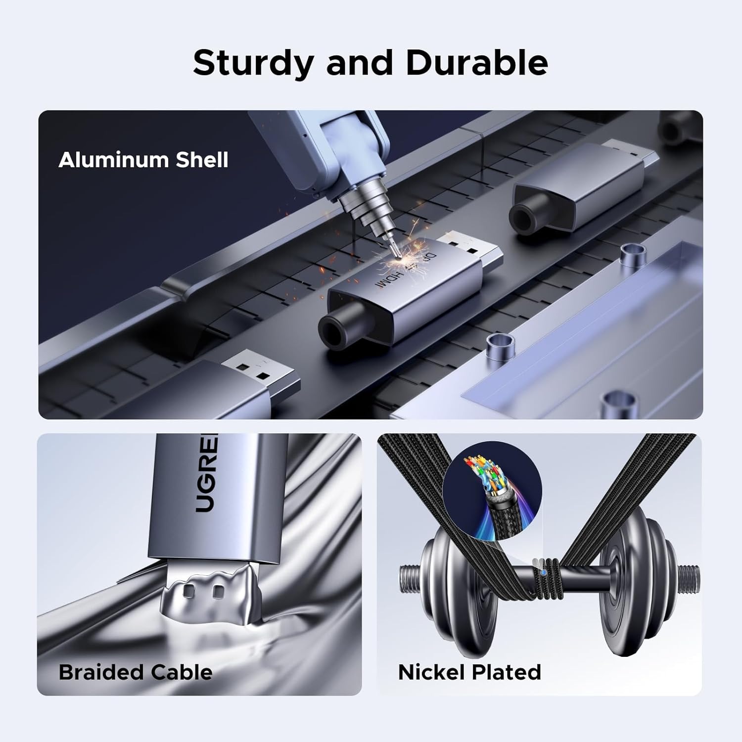 Надежный и помехоустойчивый: прочный экранированный от электромагнитных помех кабель с медными жилами 30AWG (видео)/луженой медью (питание по USB), двойной оплеткой из алюминиевой фольги и алюминия-магния, никелированными, устойчивыми к коррозии разъемами, алюминиевым корпусом радиатора и высокопрочной текстильной оболочкой, превосходящей ПВХ