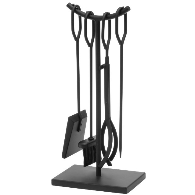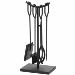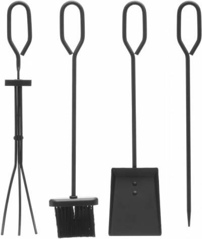 В каминный гарнитур входит подставка и четыре инструмента: лопата, щетка, утюг и плоскогубцы.