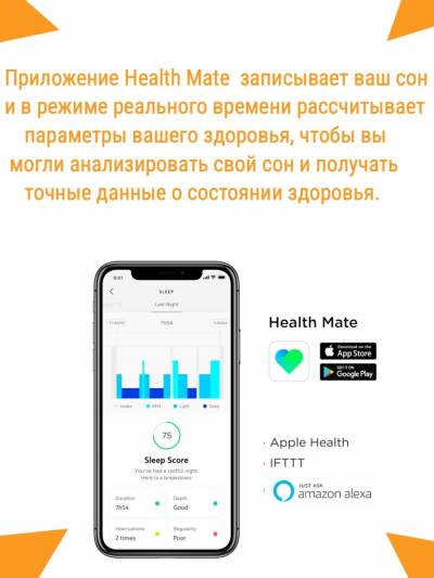 Вся статистика хранится в приложении Health Mate, синхронизация происходит через Wi-Fi. На основе этих данных система предлагает индивидуальную восьмидневную программу по улучшению сна. Её разработал известный сомнолог Кристофер Уинтер. Программа поможет вам уменьшить усталость и улучшить здоровье. Создайте свой график сбалансированного сна.