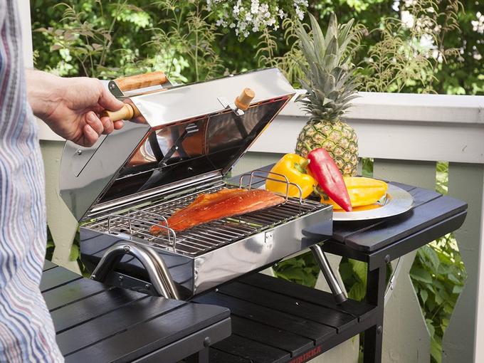 Если установить электрический тэн (нагревательный элемент) в нижнюю часть корпуса, то получается коптильня. Тэн нагревает щепу и выделяется дым, необходимый для копчения. При приготовлении гриля пища нагревается сверху нагревателем, помещенным в крышку прибора. За счет верхнего расположения нагревательного элемента не образуется дым.