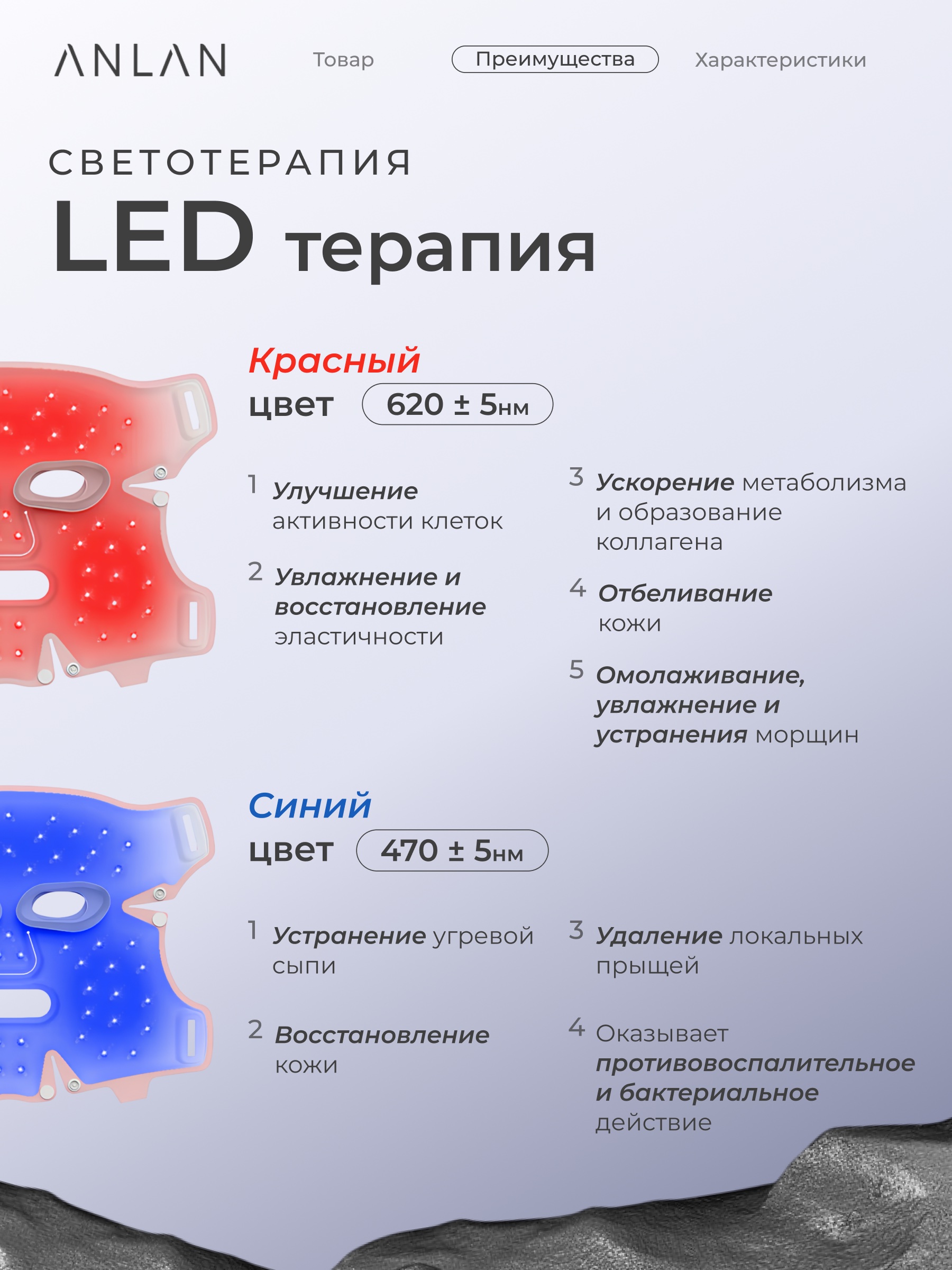 Синий свет оказывает бактерицидное и противовоспалительное действие на эпидермальные бактерии, вызывающие прыщи.Он подавляет чрезмерное секрецию кожного сала и эффективно предотвращает повторное высыпания прыщей.