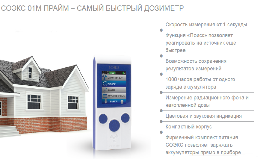 Прайм по праву можно назвать самым быстрым бытовым дозиметром. Более производительный процессор позволяет в режиме «Поиск» реагировать на источник за 1 секунду. Обладает высокой точностью измерений благодаря датчику радиации СБМ 20-1, производства Росатом. Прибор имеет понятный пользовательский интерфейс, цветовую и звуковую индикацию. Работа с ним не требует специальных знаний, достаточно лишь соблюсти правила проведения измерения, описанные в инструкции. Дозиметр оценивает радиационный фон по величине мощности ионизирующего излучения (гамма-, бета-, рентгеновское излучение).
