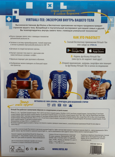 Что это такое?Обучающая анатомическая футболка Curiscope Virtuali-Tee - это волшебный и поучительный эксперимент для семьи и друзей. Вы буквально телепортируетесь внутрь своего тела с помощью уникальной технологии!