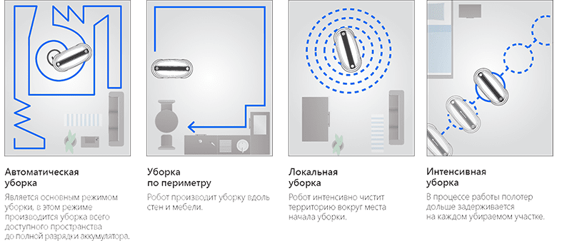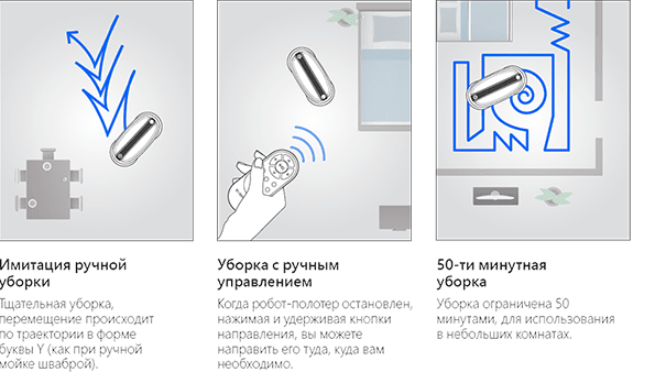 Робот-полотер работает непрерывно 100 минут. После 50 минут у него заканчивается вода в резервуарах и робот издает звуковые сигналы. Рекомендуется остановить устройство и залить новую воду в резервуары. В противном случае полотер будет продолжать уборку, но уже полусухими салфетками полировать пол до блеска.