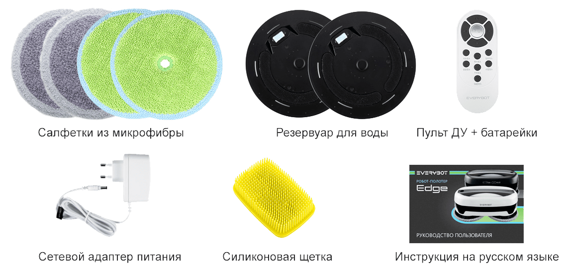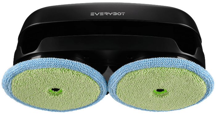 Салфетки прикрепляются на липучках к основанию резервуаров с водой. Специальная конструкция подачи воды равномерно увлажняет микрофибру на протяжении всего цикла уборки. Everybot использует резервуары для воды в качестве механизма перемещения, передавая давление на обе салфетки. Под тяжестью устройства, вращаясь со скоростью 5700 об/мин, салфетки плотно прилегают к поверхности и оттирают даже стойкие засохшие пятна от чая, кофе и других веществ. Для получения максимальной эффективности уборки рекомендуется оградить зону уборки, чтобы робот смог проехать многократно по поверхности пола.
