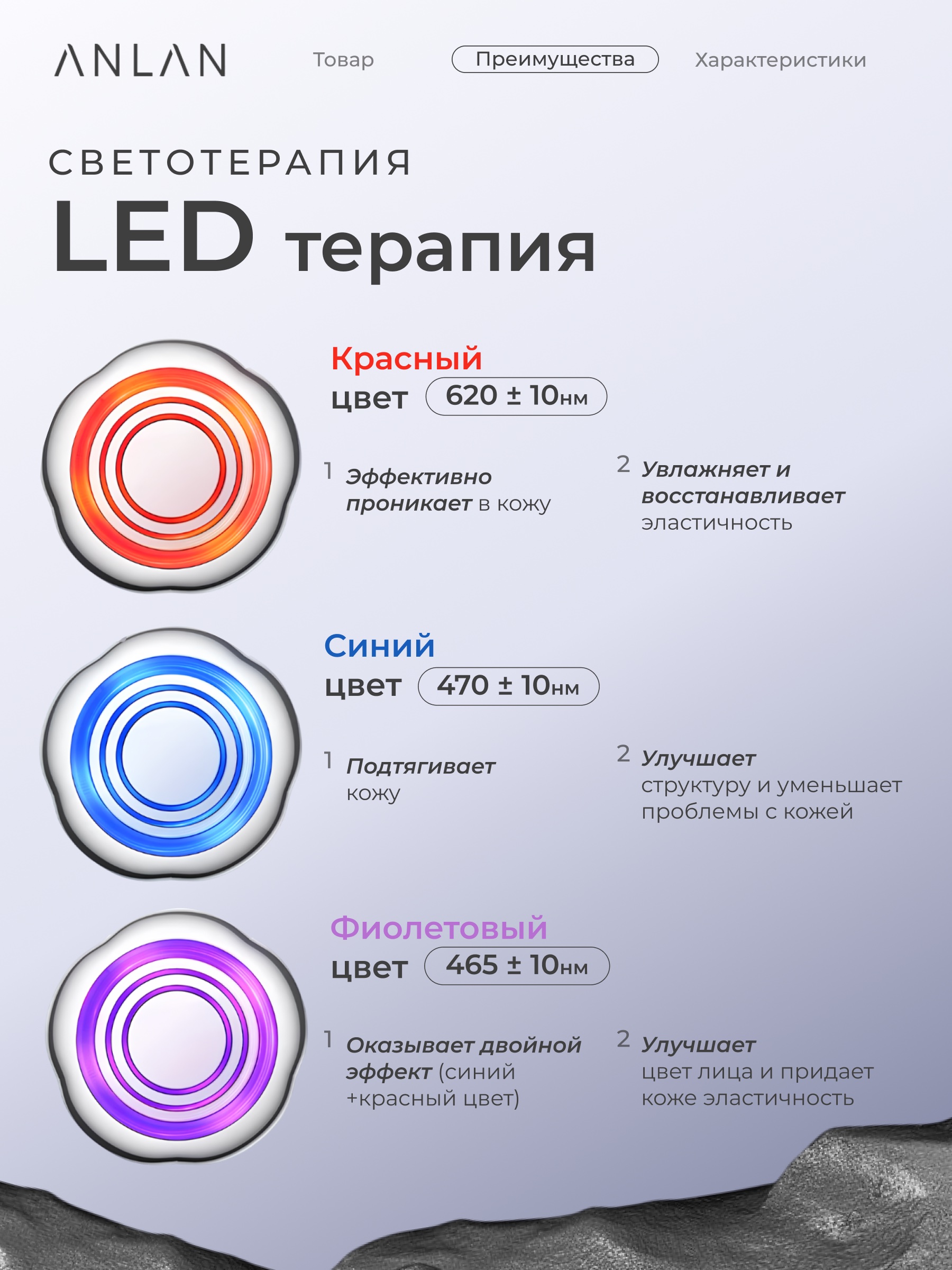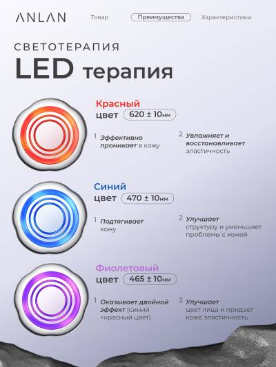Длина волны света: Красный 620±10 нм; Синий 470±10 нм; Фиолетовый 390±10 нм.