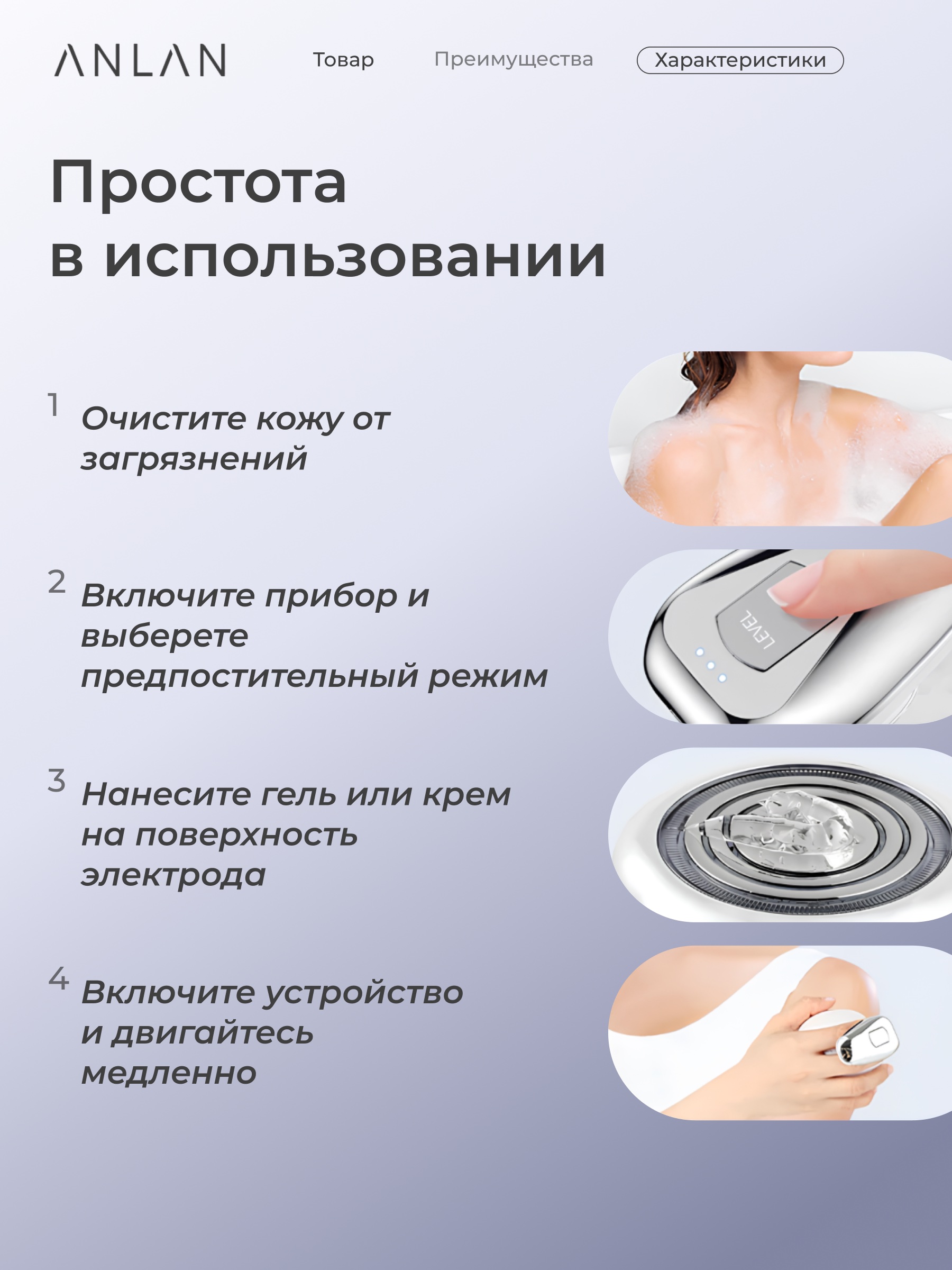 Кожа у всех разная, поэтому важно соблюдать несколько простых правил, которые превратят использование прибора в настоящее удовольствие. Наблюдайте за своими ощущениями и не массируйте одну процедуру более 10 минут. По истечении этого времени прибор автоматически отключится, чтобы исключить риск раздражения. Рекомендуется начинать массаж с режима 1 и постепенно привыкать к работе прибора.