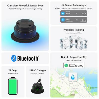 АВТОМАТИЧЕСКОЕ ОТСЛЕЖИВАНИЕ – датчик SipSense использует передовые технологии измерения веса для отслеживания каждого глотка и синхронизируется с приложением, чтобы учитывать вашу ежедневную норму потребления воды. Зарядка через USB-C, до 21 дня без подзарядки.