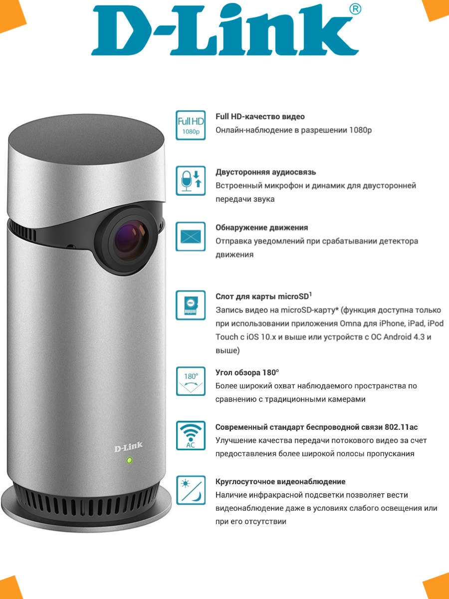 Сетевая Full HD-камера серии Omna DSH-C310 с углом обзора 180° является первой камерой D-Link, сертифицированной Apple и интегрированной в систему «умного дома» Apple HomeKit. С камерой DSH-C310 Вы всегда сможете быть в курсе происходящего у Вас дома. DSH-C310 оснащена слотом для карты microSD1, поддерживает функции двусторонней аудиосвязи и ночной съемки, а стильный современный дизайн данного устройства позволяет ему органично вписаться в многообразие домашних интерьеров.