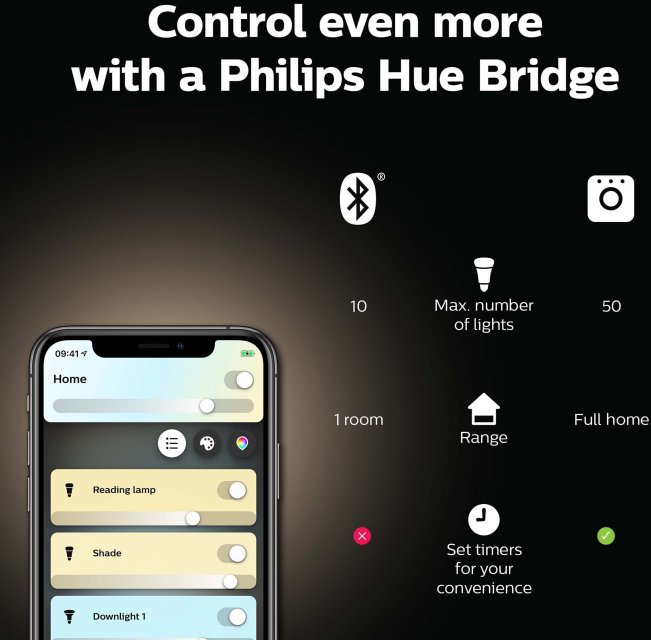 Для работы необходим блок управления Philips Hue Bridge 2nd Gen White либо приложение Philips Hue Bluetooth.
