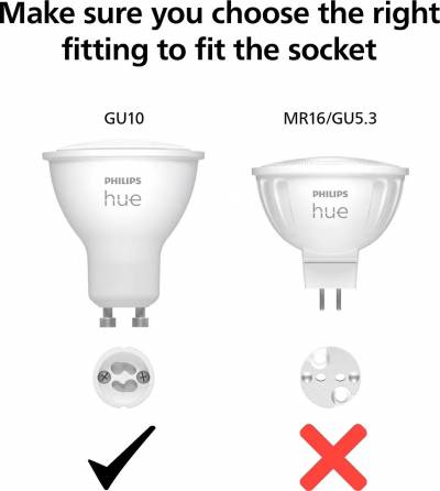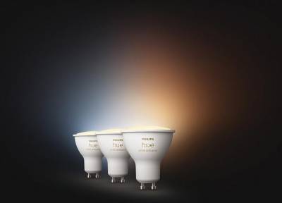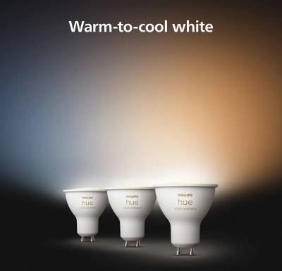 Philips Hue GU10 характеризуется мощностью 4,3 Вт, возможностью менять белый свет от теплого до холодного оттенка (2200К - 6500К) и световым потоком в 350 люмен.