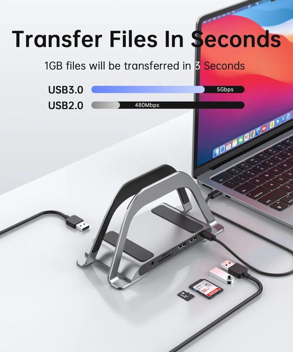 Эта док-станция для MacBook Pro имеет 2 порта USB 3.0 и один порт USB C для передачи файлов со скоростью до 5 Гбит/с. 1 порт USB 2.0 позволяет без задержек подключать беспроводную мышь/клавиатуру.