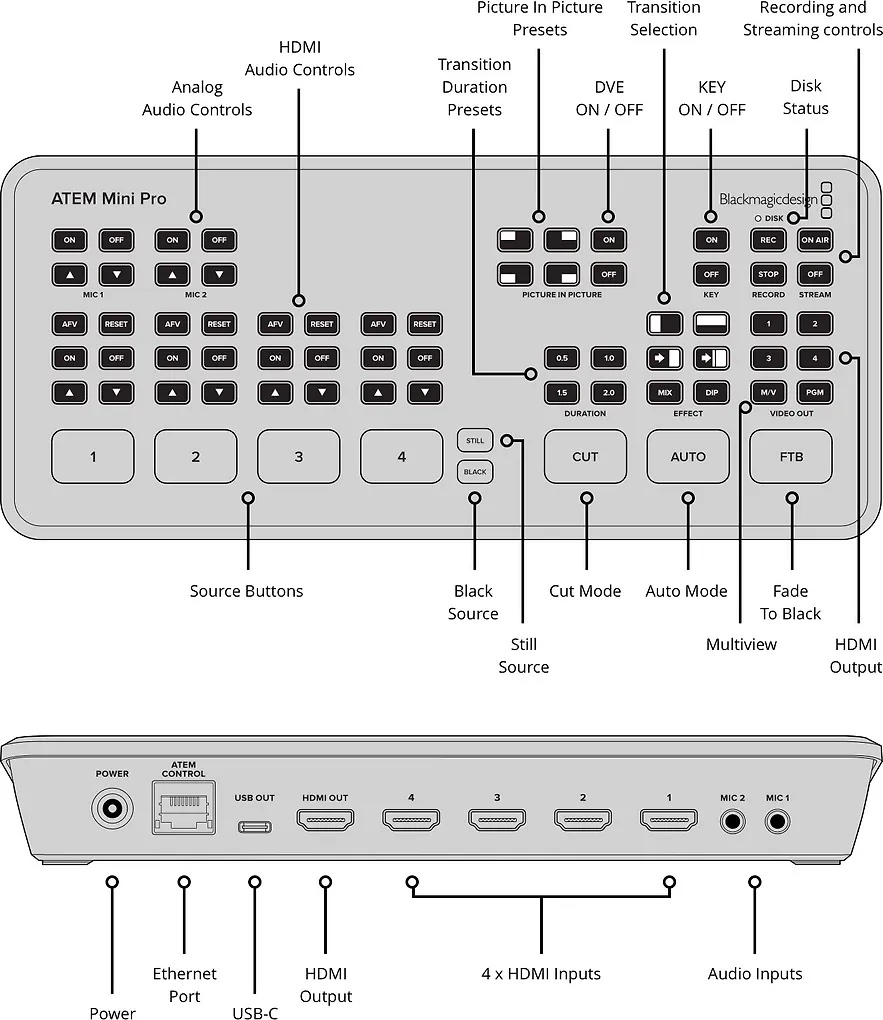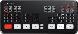 ATEM Mini Pro быстро настраивается и прост в использовании. Он включает в себя 4 преобразованных в стандарты входа HDMI, выход USB для веб-камеры, выход HDMI, аудиомикшер Fairlight с эквалайзером и динамикой, DVE для картинки в картинке, эффекты перехода, хроматический ключ зеленого экрана, медиа-пул из 20 кадров для титров и бесплатное программное управление ATEM.