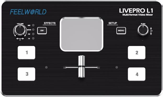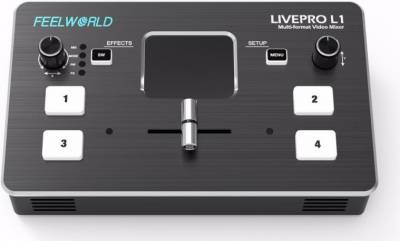 Видеомикшер Feelworld Livepro L1 предназначен для одновременного подключения 4 внешних источников сигнала HDMI и микширования с различными эффектами с трансляцией.