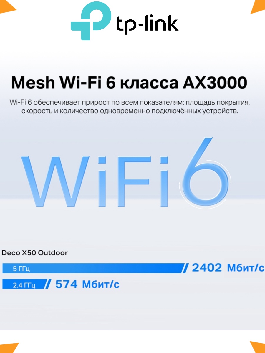 Скорость Wi-Fi AX3000: 2,4 ГГц: до 574 Мбит/с (802.11ax), 5 ГГц: до 2402 Мбит/с (802.11ax)