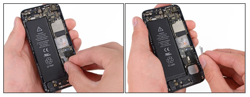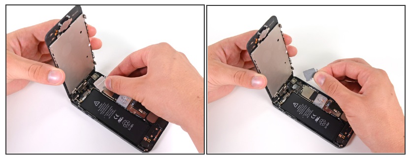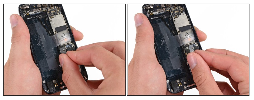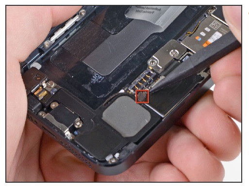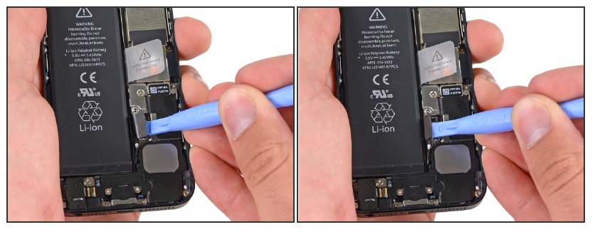 - Используя тонкий конец инструмента, аккуратно отсоедините разъем Lightning из гнезда на плате телефона.