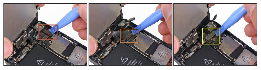 - Используйте пластиковый инструмент, чтобы отключить три шлейфа дисплейного модуля: