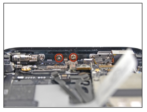 - Удалите следующие два винта, крепящие металлическую планку над аккумуляторным разъемом на плате: