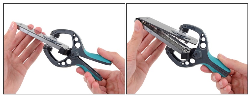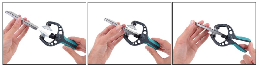 - Откройте ручки инструмента iSclack чтобы зафиксировать присоски на нижней и верней части iPhone, плотно прижмите присоски к телефону.