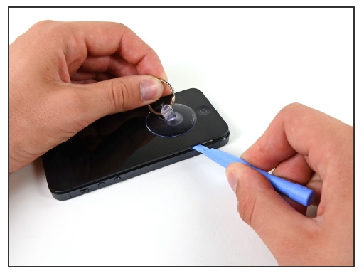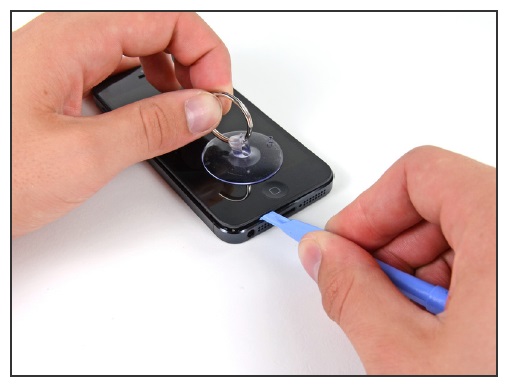 - Пластиковым инструментом для открывания начните аккуратно оттягивать корпус вниз, от дисплейного модуля, одновременно вытягивая присоску вверх.