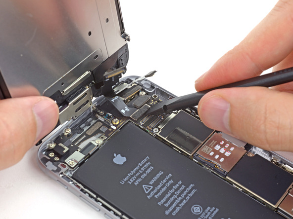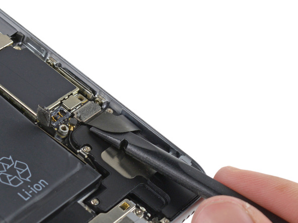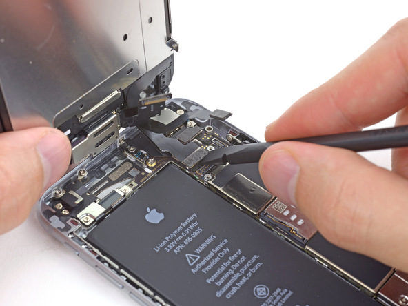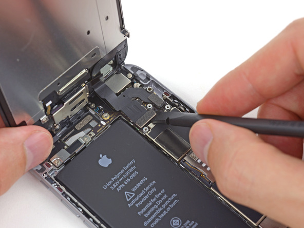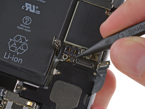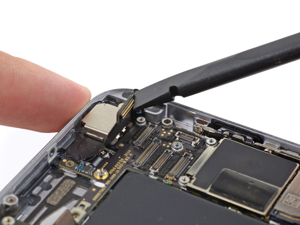 - С помощью пластикового инструмента, отсоедините разъем шлейфа порта Lightning от материнской платы и отведите его в сторону.
