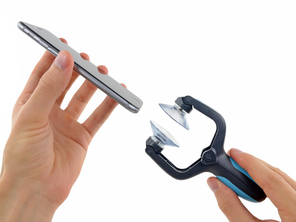 - Откройте ручки инструмента iSclack чтобы зафиксировать присоски на нижней и верней части iPhone, плотно прижмите присоски к телефону.