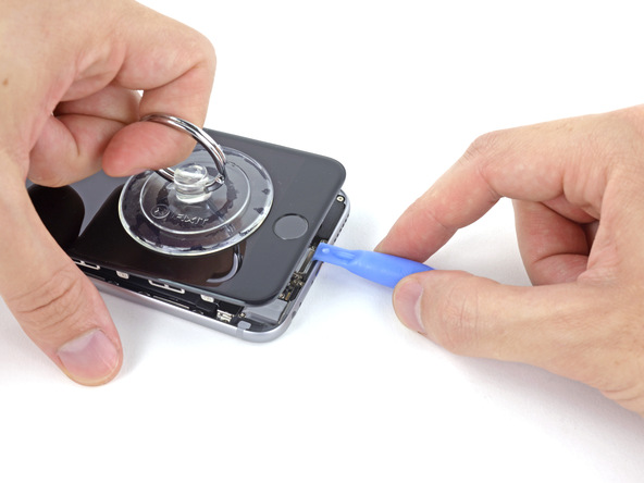 - Удерживая iPhone одной рукой, потяните присоску вверх, чтобы слегка отделить дисплейный модуль от корпуса.